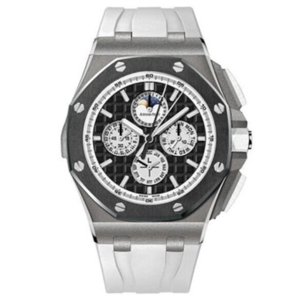 Grey titanium case with a white rubber strap. Fixed black ceramic bezel. Openwork dial with silver-tone hands and stick hour markers. Minute markers around the outer rim. Dial Type: Analog. Luminescent hands and markers. Month, day of the week and date sub-dials. Four sub-dials displaying: moonphase, date, day and month. Audemars Piguet Calibre 2885 Automatic movement, containing 52 Jewels, composed of 648 parts, bitting at 19800 vph, and has a power reserve of approximately 45 hours. Scratch resistant sapphire crystal. Screw down crown. Skeleton case back. Octagon case shape, case size: 44 mm. Tang clasp. Water resistant at 20 meters / 65 feet. Functions: perpetual calendar, moon phase, chronograph, column wheel, rattrapante, month, date, day, hour, minute, small second, minute repeater. Royal Oak Offshore Series. Luxury watch style. Watch label: Swiss Made. Item Variations: 26571IO OO A010CA 01, 26571IO-OO-A010CA-01, 26571IOOOA010CA01. Audemars Piguet Royal Oak Offshore Chronograph Perpetual Calendar Men’s Watch 26571IO.OO.A010CA.01.