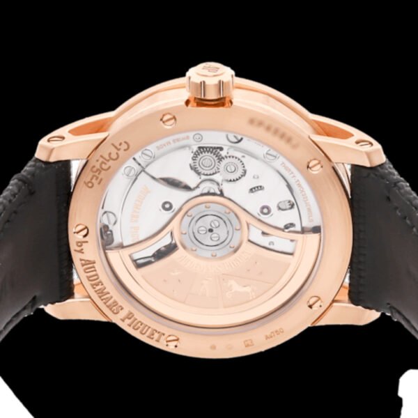Driven by a self winding movement, this watch guarantees accurate timekeeping, ensuring you never miss a beat. The transparent case back allows you to marvel at the intricate inner workings of the mechanism, a testament to Audemars Piguet’s technical prowess.