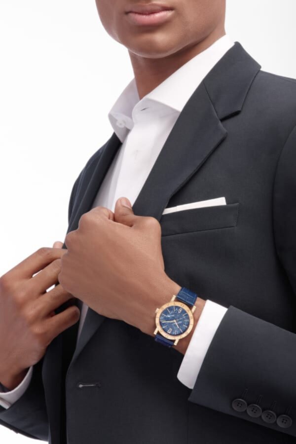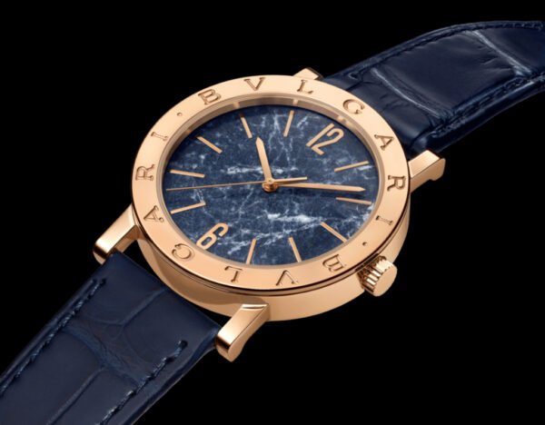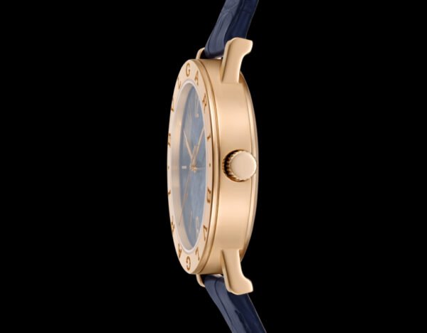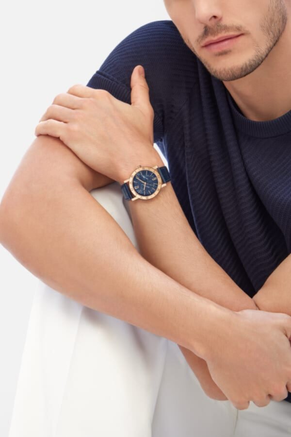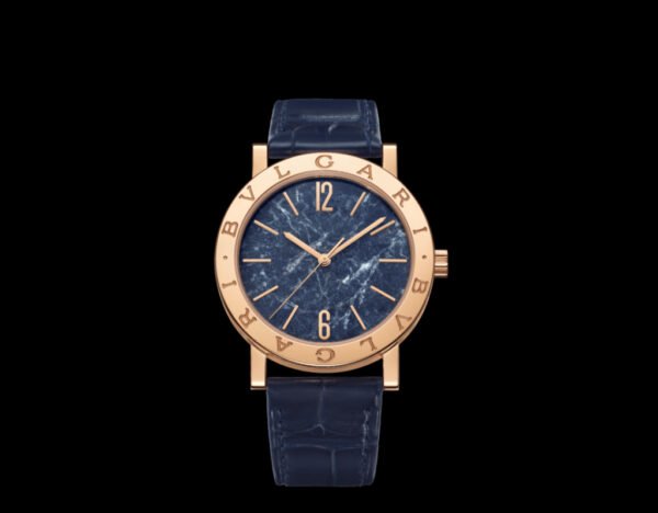 Bvlgari Bvlgari watch with in-house mechanical movement, automatic winding, hour and minute functions, BVL 191 caliber (3.80 mm thick), 28,800 VpH (4Hz) frequency and 42-hour power reserve. 38-mm 18 kt rose gold case and bezel engraved with double logo, blue marble dial, rose gold-plated hands and indexes, 18 kt rose gold crown, blue alligator strap and 18 kt rose gold pin buckle. Water-resistant up to 50 meters.
