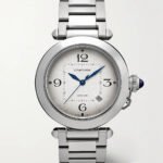 The Cartier Drive De Cartier Extra-Flat Men’s Watch WSNM0011 boasts a 38 x 39mm stainless steel case and bezel, complemented by a blue leather strap with a stylish pattern. Its silver dial showcases elegant Roman numeral hour markers and sleek blued-steel sword-shaped hands, all powered by the Cartier Calibre 430 MC manual winding movement.