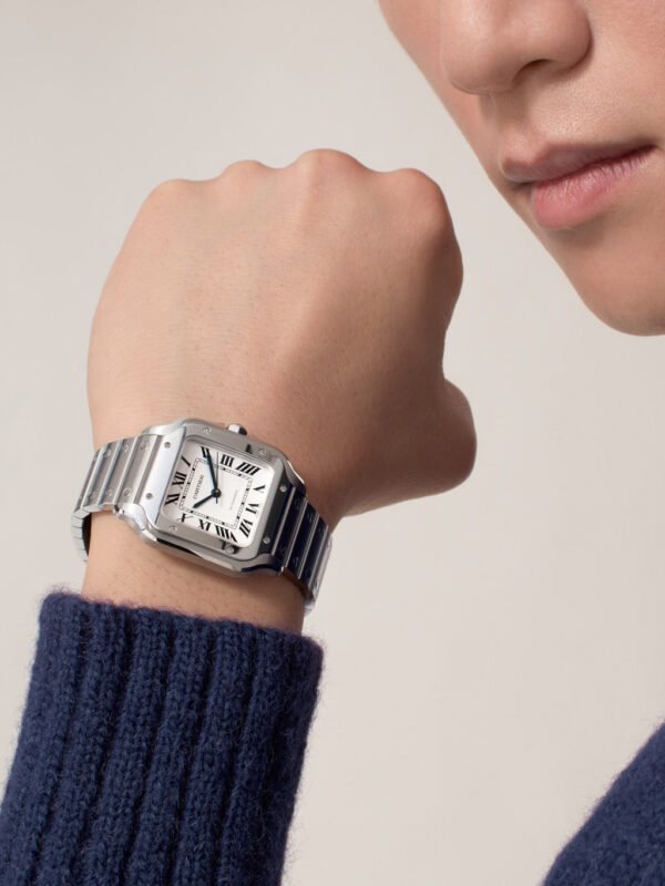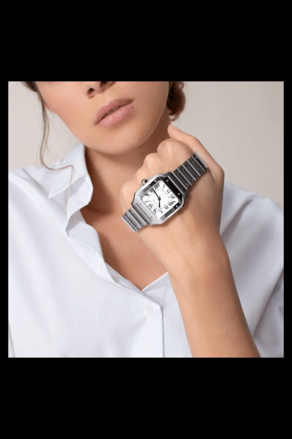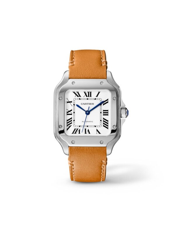 Santos watch, medium model, Manufacture mechanical movement with automatic winding, caliber 1847 MC. Steel case, 7-sided crown set with a faceted synthetic spinel, silvered opaline dial, steel sword-shaped hands, sapphire crystal. Steel bracelet with “SmartLink” adjustment system. Second bracelet in calfskin, with interchangeable steel folding buckle. Both bracelets are fitted with the “QuickSwitch” interchangeability system. Case width: 35.1 mm, thickness: 8.83 mm. Water-resistant up to 10 bar (approx. 100 meters/100 feet).