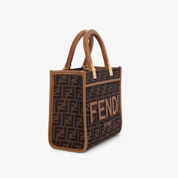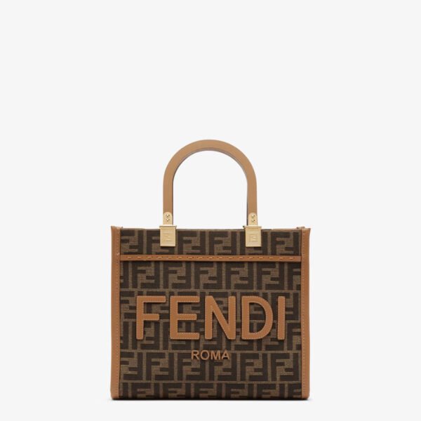 Made of jacquard fabric with the iconic FF motif in brown, with “Fendi Roma” lettering applique in beige leather. Stiff beige leather handles.