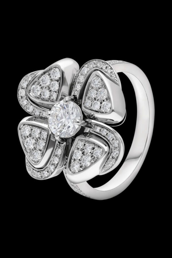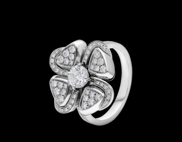 Blooming amongst the marvels of the Eternal City, Fiorever draws inspiration from the alluring four-petal flower cherished by the Romans as a symbol of happiness and joy. The blend of two meaningful words, Fiore, Italian for flower, and forever, Fiorever celebrates the Roman love for life with a striking, passionate design. Reimagining the multifaceted beauty of nature, Bvlgari’s precious floral icon sparkles eternally with four white gold and diamond petals embracing a central diamond. Fiorever ring in 18 kt white gold with a central diamond and pavé diamonds.