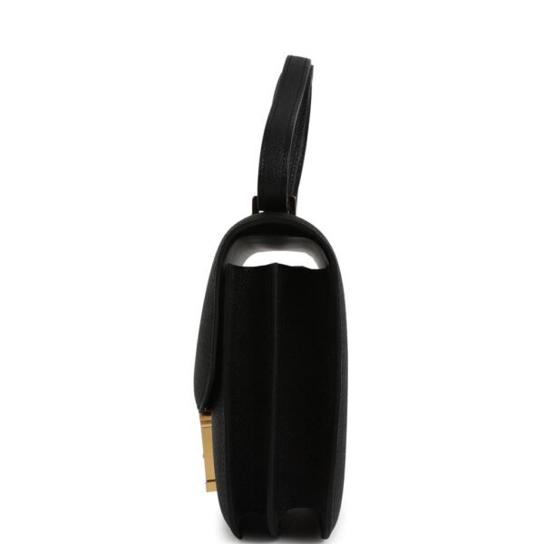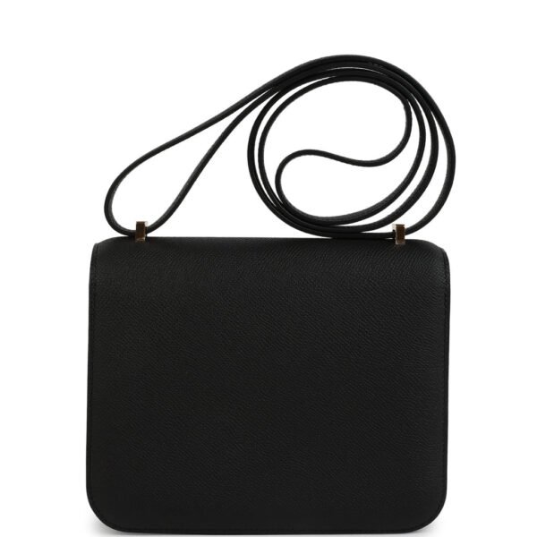 This Constance 1-18 is in Black epsom leather with gold hardware and has tonal stitching, a metal “H” snap lock closure and adjustable shoulder strap.