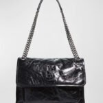 This Evelyne is in Black clemence leather with palladium hardware and has tonal stitching, pull tab top closure and Black removable canvas and leather shoulder/crossbody strap.