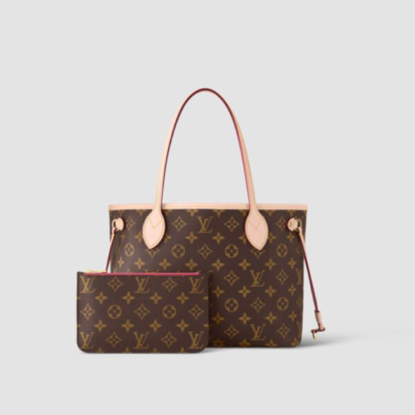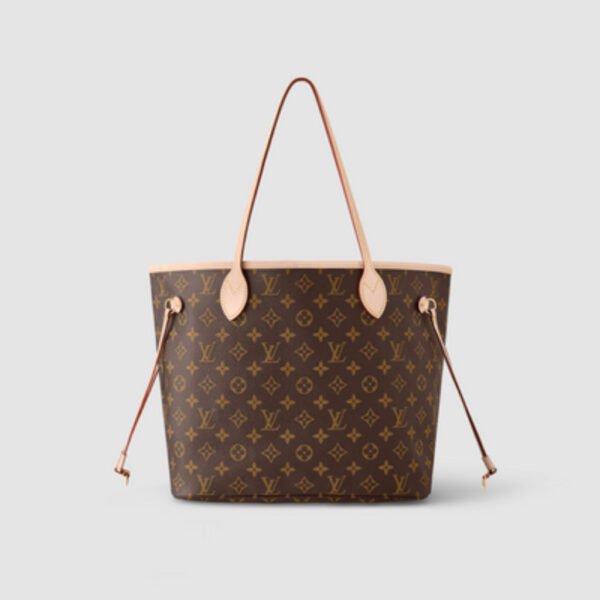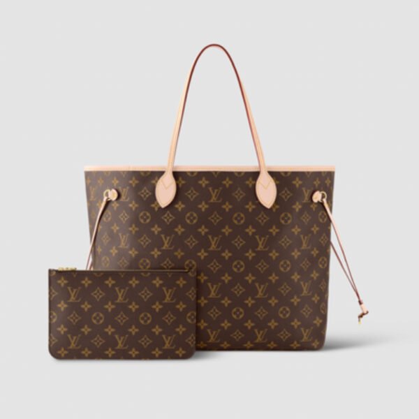 - The Neverfull MM tote unites timeless design with heritage details. Made from supple Monogram canvas with natural cowhide trim, it is roomy yet not bulky, with side laces that cinch for a sleek allure or loosen for a casual look. Slim, comfortable handles slip easily over the shoulder or arm. Lined in colorful textile, it features a removable pouch which can be used as a clutch or an extra pocket.
