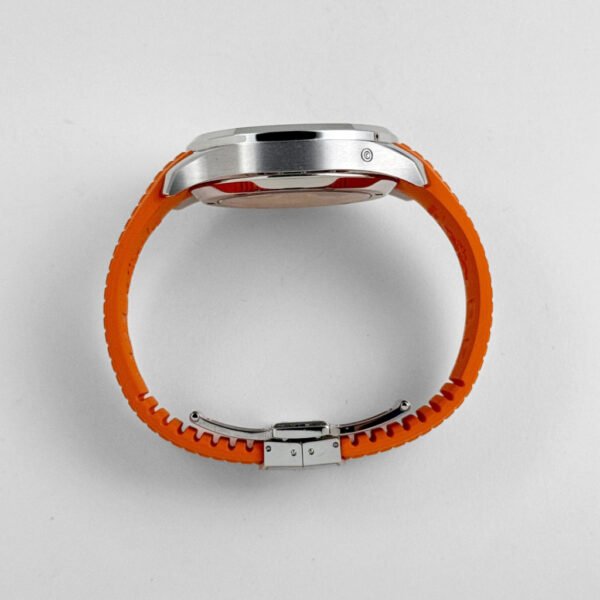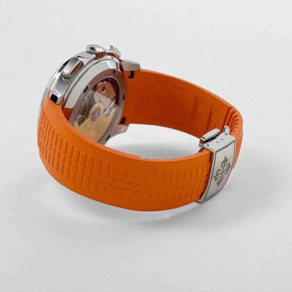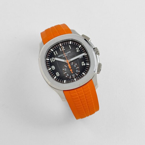 Introducing the Patek Philippe Aquanaut Chronograph 5968A-001, a dynamic and sophisticated timepiece that combines the sporty aesthetics of the Aquanaut collection with the precision and functionality of a chronograph. Crafted by the esteemed Swiss watchmaker, Patek Philippe, this watch is a testament to the brand’s unwavering commitment to excellence and innovation. The Aquanaut Chronograph 5968A-001 features a robust stainless steel case with a diameter of 42.2mm, exuding a bold and contemporary presence on the wrist. The distinctive black dial is adorned with luminescent Arabic numerals, baton-style hour markers, and bold orange accents, providing optimal legibility and adding a sporty touch to the overall design. Equipped with Patek Philippe’s self-winding mechanical chronograph movement, this watch offers precise timekeeping and chronograph functions.