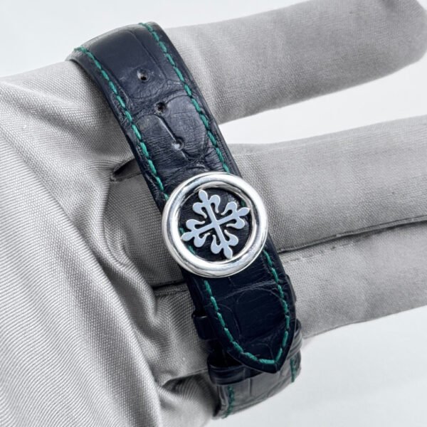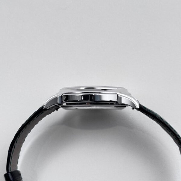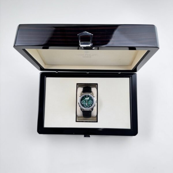 The Patek Philippe 5270P-014 Perpetual Calendar is a masterpiece of haute horology, combining technical brilliance with breathtaking aesthetics. Housed in a 41mm polished platinum case, this timepiece showcases a striking sunburst green dial with black gradation, giving depth and intensity to its rich color. The dial features day, date, month, leap year, and day/night indicators in a clean and legible layout, along with a moon phase display and a tachymeter scale around the periphery. Powered by the manual-winding Caliber CH 29-535 PS Q, this chronograph movement with a perpetual calendar is visible through the sapphire caseback, revealing its hand-finished beauty. Elegant, complex, and undeniably prestigious, the 5270P-014 exemplifies the pinnacle of Patek Philippes watchmaking legacy.