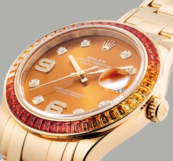 | Bracelet: | 18k yellow gold Pearlmaster bracelet with a hidden clasp. Fits a 7.5″ wrist. |