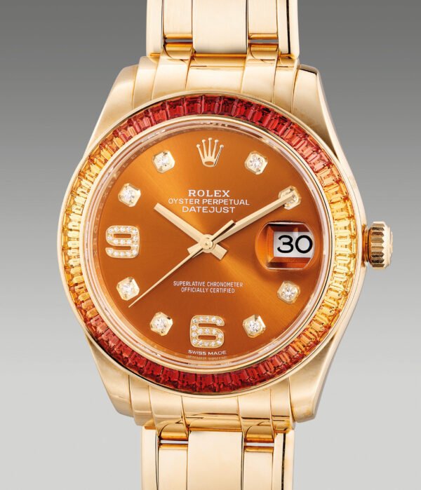 | Bezel: | Bezel set with original Rolex factory baguette cut sapphires forming a gradient from red to yellow. |