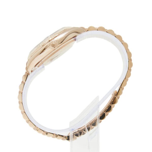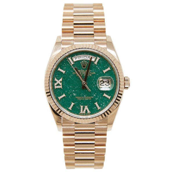 Finely crystallized. This dial features hour markers in 18 kt gold, set with 32 diamonds, and a Roman VI and IX in 18 kt gold, set with 24 diamonds. It is cut from green aventurine, a stone with a finely crystallized surface. Rose gold color hour, minute and second hands. Date display window at 3 o’clock position, day of the week display at 12 o’clock position. Screw-down 18k rose gold crown. Automatic 31-Jewel Chronometer movement. 18k rose gold President bracelet with hidden deploy buckle. Water resistant 100m/330ft.