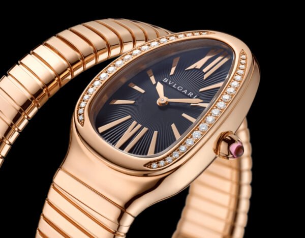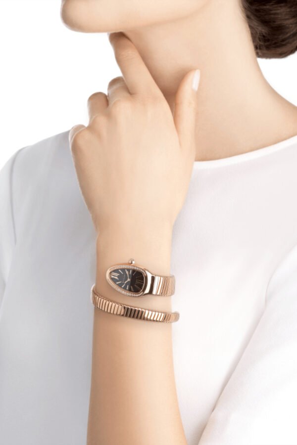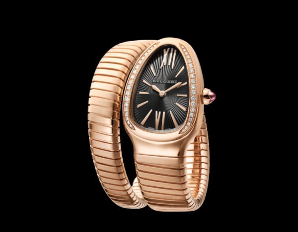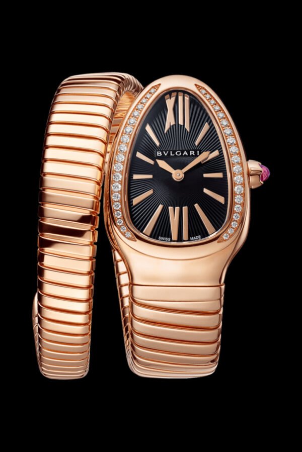 Merging two of the most iconic symbols of Bvlgari design, the Serpenti Tubogas watch coils the sinuosity of the snake with the contemporary soul of tubogas. Evoking both the sensual curves of a woman and the fluid shape of the serpent, the timepiece is crafted with the shapely lines of this specific technique, with a flexible and tubular litheness. Radiating glamour and a truly individual style, this watch marks a distinctive chapter in the constant evolution of Serpenti. Serpenti Tubogas watch with quartz movement, 35 mm 18 kt rose gold curved case set with brilliant cut diamond, 18 kt rose gold crown set with a cabochon cut pink rubellite, black opaline dial with guilloché soleil treatment and hand-applied indexes, single spiral 18 kt rose gold bracelet.