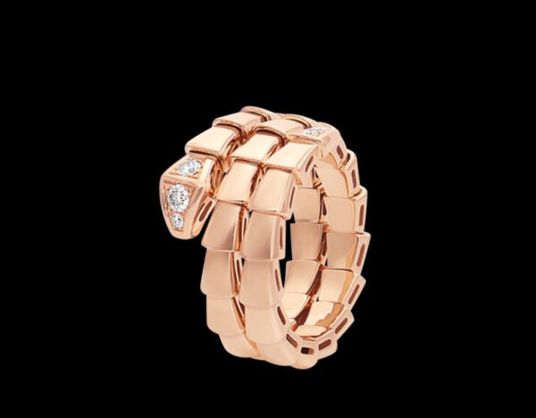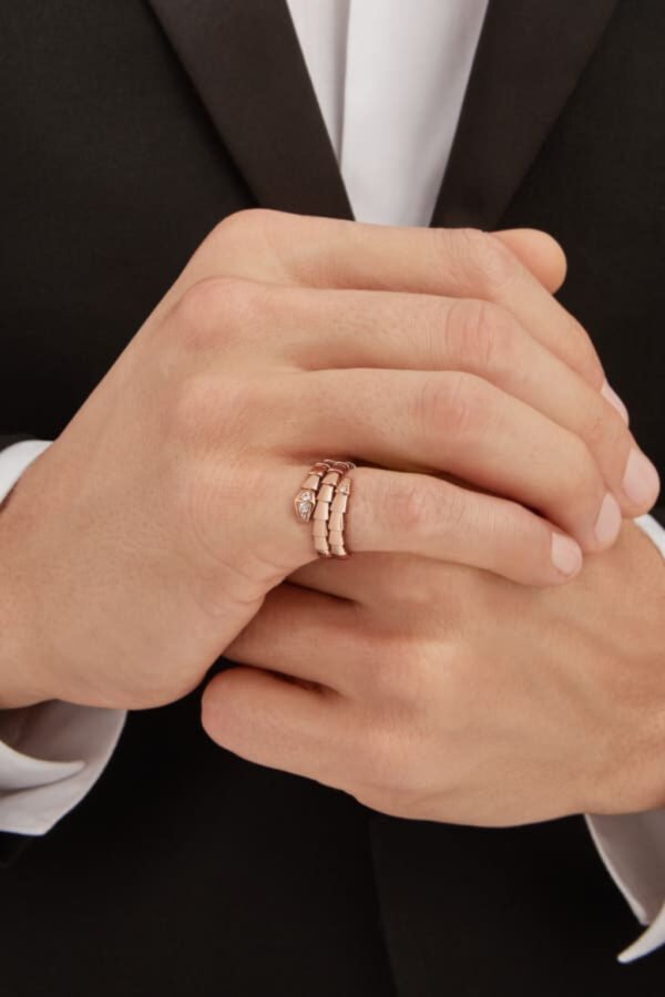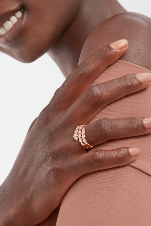 With its signature blend of pure aesthetics, enveloping shapes and charismatic flair, the Serpenti Viper 18 kt rose gold ring with demi pavé diamonds is an essential interpretation of Bvlgari’s icon of endless metamorphosis. Capturing the powerful and ever-evolving nature of the mythical serpent, the magnetic jewelry creation inspires us to embrace change as a source of strength and self-confidence. Easy to mix and match, the ring offers endless styling options, embodying the collection’s versatile spirit.