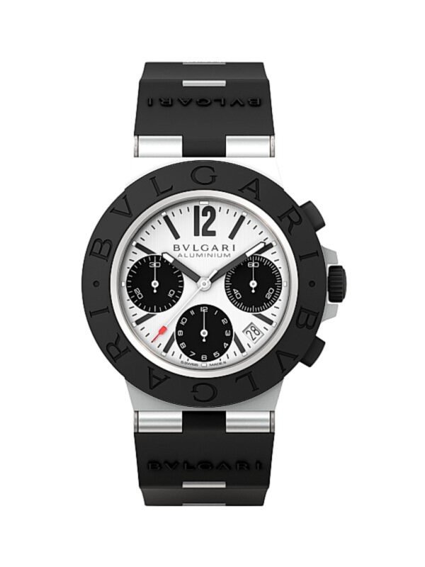 BVLGARI’s two-tone chronograph watch features a white dial with three sub-dials and a date display window. This style flaunts a logo-embellished bezel on a bracelet strap.