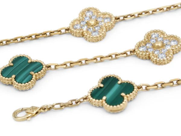 This rare beauty features 20 of Van Cleef & Arpels’ (VCA) Iconic Alhambra (Four-Leaf Lucky Clover) Motifs which alternate with malachite stones and paved Diamonds motifs. VCA hand selects each diamond to ensure they are the highest quality diamonds on earth! The brilliance and majesty is glorious!